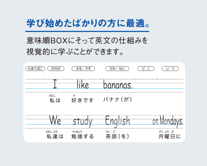 英語を学ぶ画期的なアイデアに基づいて開発された『意味順ノート』。文法用語を使わず、英語の語句の並び順を身につけられ、感覚的に英語を学習できます。