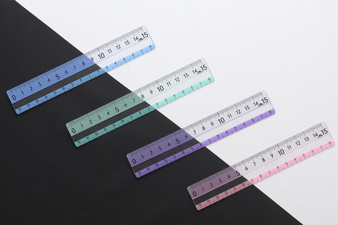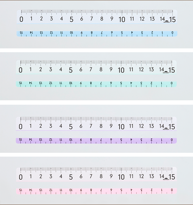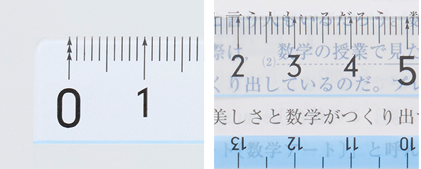 「最大の特徴が、どんな色の上でもメモリがよく見えるところ。メモリ周辺に施された特殊印刷により、黒や紺などの濃い色や文字の上でもはっきり見えます。メモリは5センチごとに大きな数字がデザインされていてわかりやすく、角が丸い安心設計。定規が机の端にはみ出したときも安心です。さらに、定規中央には『読み取りスペース』があり、読んでいる行に透明の窓をあてると文字に集中しやすくなります。定規は落としたりノートのすき間に挟まったりして意外と無くしやすいので、複数購入してストックしておくのがおすすめです」