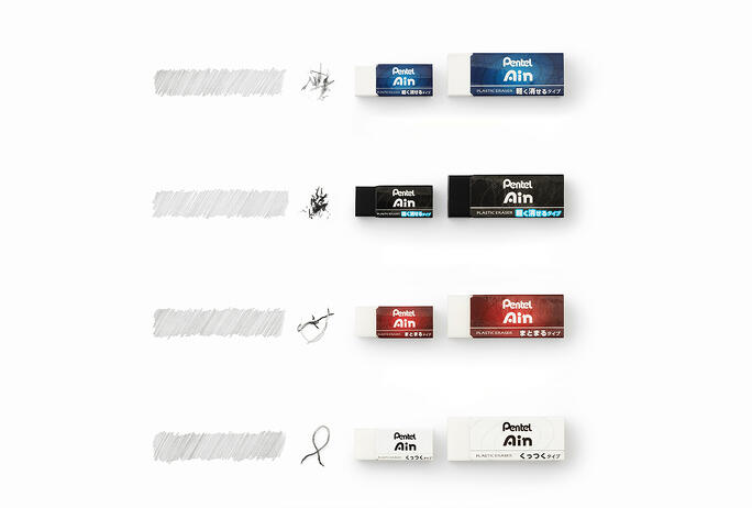 『Pentel Ain 消しゴム』は、写真上から「軽く消せるタイプ」「軽く消せるタイプ ブラック」「まとまるタイプ」「くっつくタイプ」の4種類。それぞれ大・小の2サイズ展開。