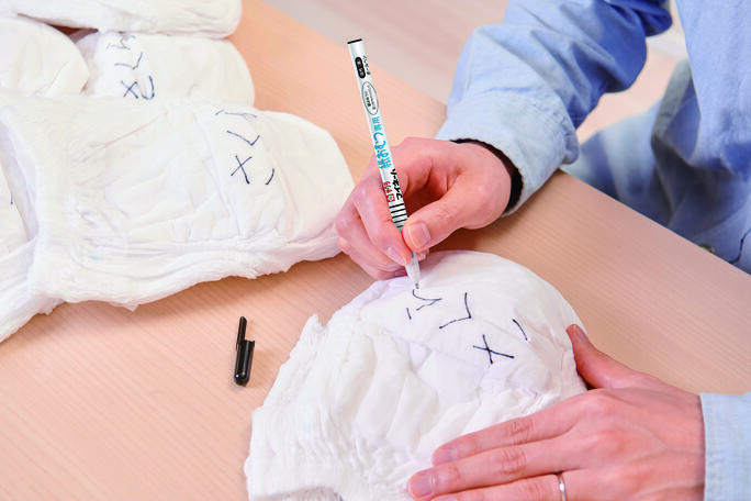 紙おむつの表面繊維に引っかかりにくいボールペンタイプの『マイネーム紙おむつ専用』も。