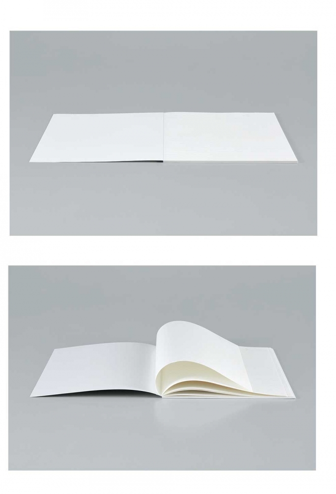 開いたとき究極の「フラット状態」になるノートです。一般的なノートは、ページを開いたときに中央が下の写真のように盛り上がります。『キャンパス フラットが気持ちいいノート』は、ノートの背部分ののりを、強度を保ちながらもできるだけ薄くすることで、上の写真のようなフラットな状態を実現しています。