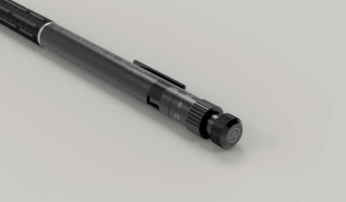 真鍮削り出しのボディ。キャップ部分の芯硬度表示ダイヤルは手触り抜群。