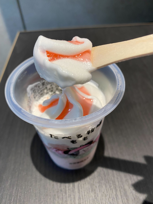 一番上の層では、なめらかなミルクアイスに白桃ソースがかかり、桃の香りを満喫。そして、その下にはなめらかな白桃果肉ソースと白桃アイス! 三層構造になっており、食べ進めるごとにミルクアイスの甘さと、桃の濃厚かつさっぱりとした味わいの変化を楽しめます。まさに桃づくし。桃好きにはたまらない、大満足の一品でした。