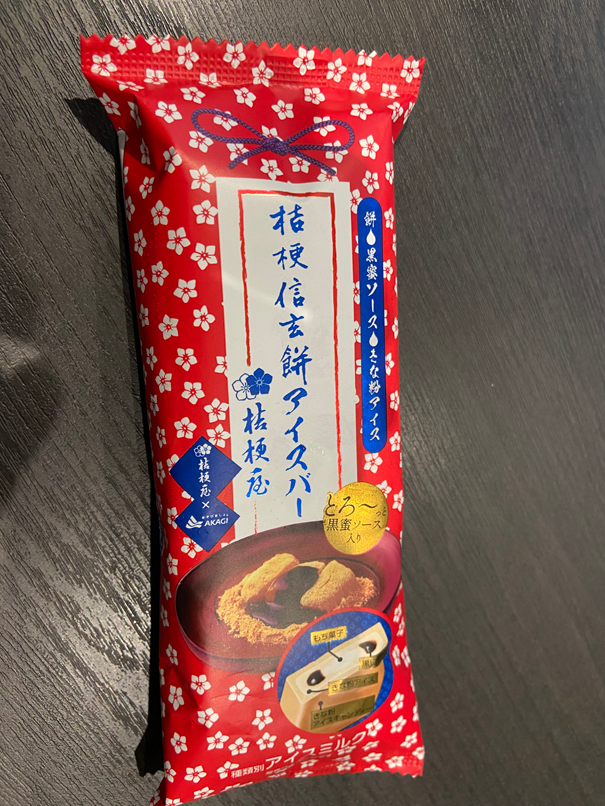 Dくんが食べたのは、人気の山梨銘菓「桔梗信玄餅」とのコラボアイス「桔梗信玄餅アイスバー(スティック)」(赤城乳業株式会社)。