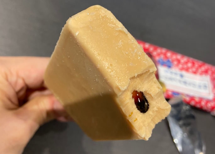きな粉アイスにガブッとかぶりつくと、中からとろ~り黒蜜ソースとやわらかいもち菓子がお目見え。和風な味わいが冷たいアイスになって、感動的な美味しさです。