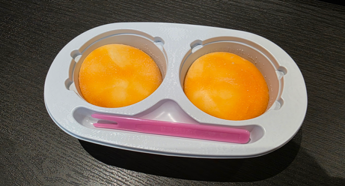 パッケージを開けてみると、きれいなオレンジ色のだいふくが二つ。通常の雪見だいふくとは異なり、外側のお餅もマンゴーをイメージした橙色になっていました。中にはアイスクリームと濃厚なマンゴーソースが入っています。