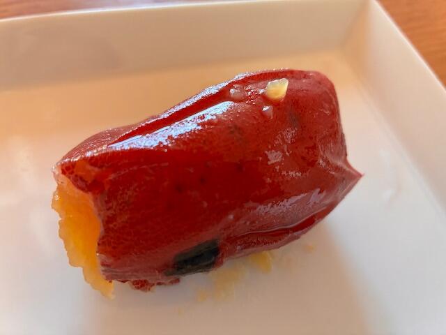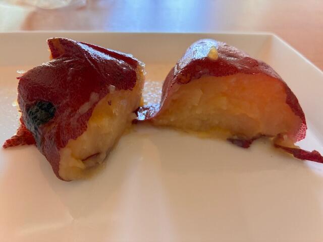 スプーンをスッと入れて半分に切ってみると、さすがは熟成された「紅優甘(べにゆうか)」。全体が蜜でとろとろに輝いています。