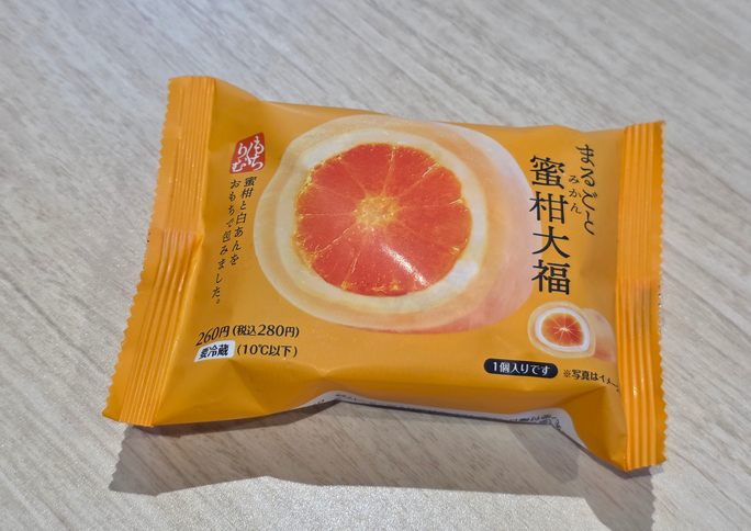 Sさんが最初に食べたのは、ファミリーマートで限定発売されている「まるごと蜜柑大福」。その名の通り大きな大福の中に白あんとミカン1個が丸っと入った、コンビニスイーツとは思えない贅沢な商品です。