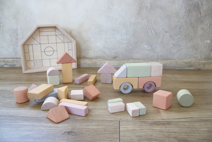 1歳から使える積み木を選ぶなら、いろいろな「かたち」があるものがおすすめです。丸・三角・四角などの「かたち」にふれて、丸いものはコロコロと転がる、三角の積み木の上には積めない、四角い積み木の上には積めるなどの体験をしていきましょう。「さんかくだね」「しかくの積み木、ひとつどうぞ」など、「さんすう言葉」で遊ぶのも楽しいですね。少し大きくなったら、同じ形を集めたり、色で分けたりするのも◎。算数の「仲間分け」の学びにつながっていきますよ。