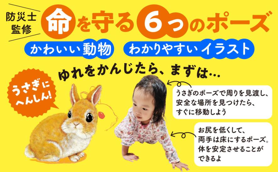 本作は、地震発生時に命を守る、6つの「防災ポーズ」を身に着けられる絵本。