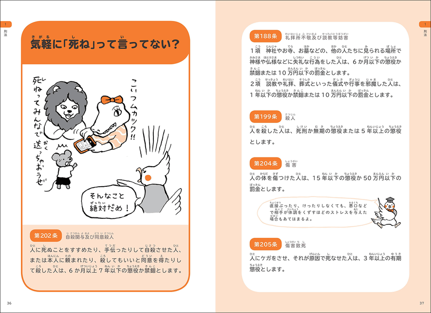 ――《気軽に「死ね」って言ってない?(刑法第202条、自殺関与及び同意殺人)や《おどして何かをさせたらダメ!(刑法第223条、強要)》など、ふだんの生活で実際にありそうなシーンのイラストやコメントが興味深いですね。