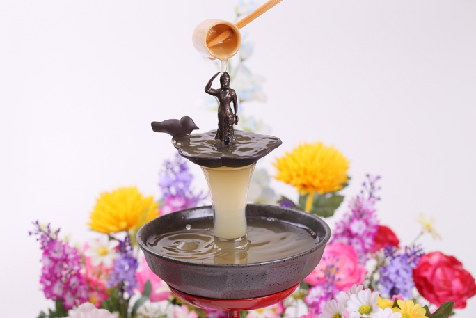 その花御堂に、甘茶を満たした浴仏盆《よくぶつぼん》というお盆を置き、浴仏盆の中央に誕生仏(小さなブッダ像)をまつります。
