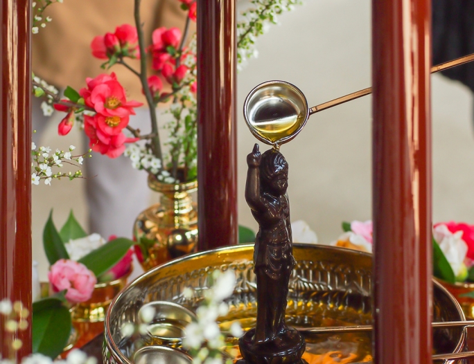 誕生仏に、ひしゃくで甘茶を注いでお祝いするのが、お花祭りのならわしです。
