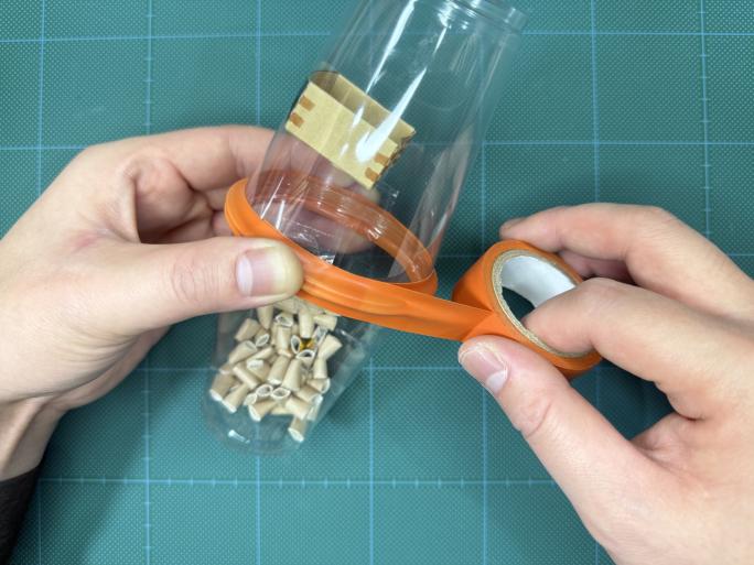 ④ ビニールテープ(なければセロテープ)で、豆が出てこないように、飲み口を巻きます。