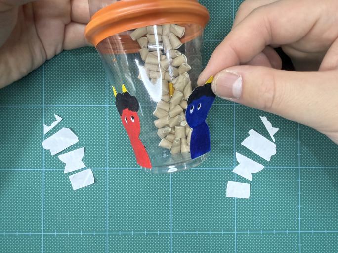 最後に「豆」と「升」をプラコップに入れて、「まめマラカス」を作ります!