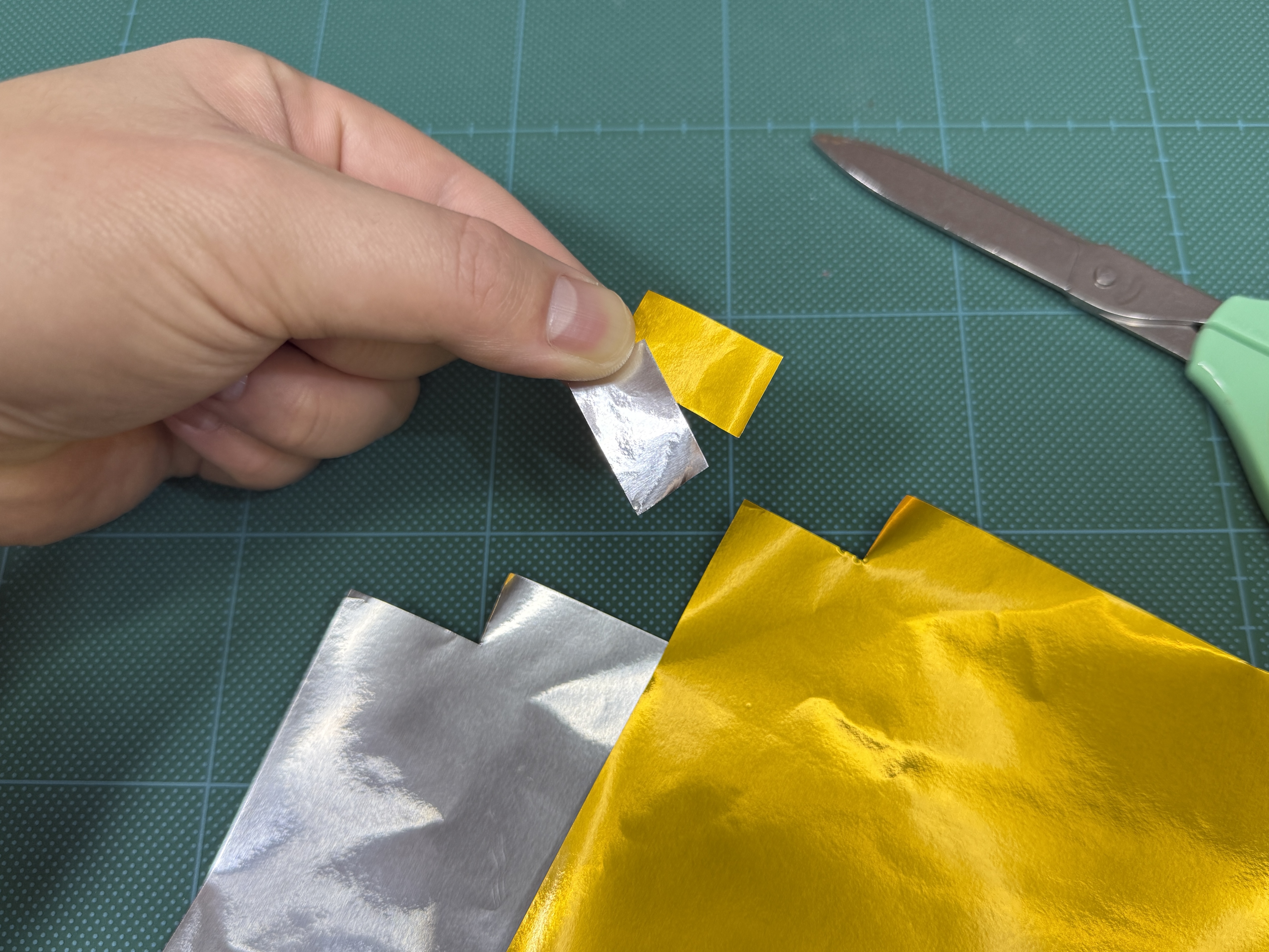 ① 金と銀の折り紙を小さく切ります。