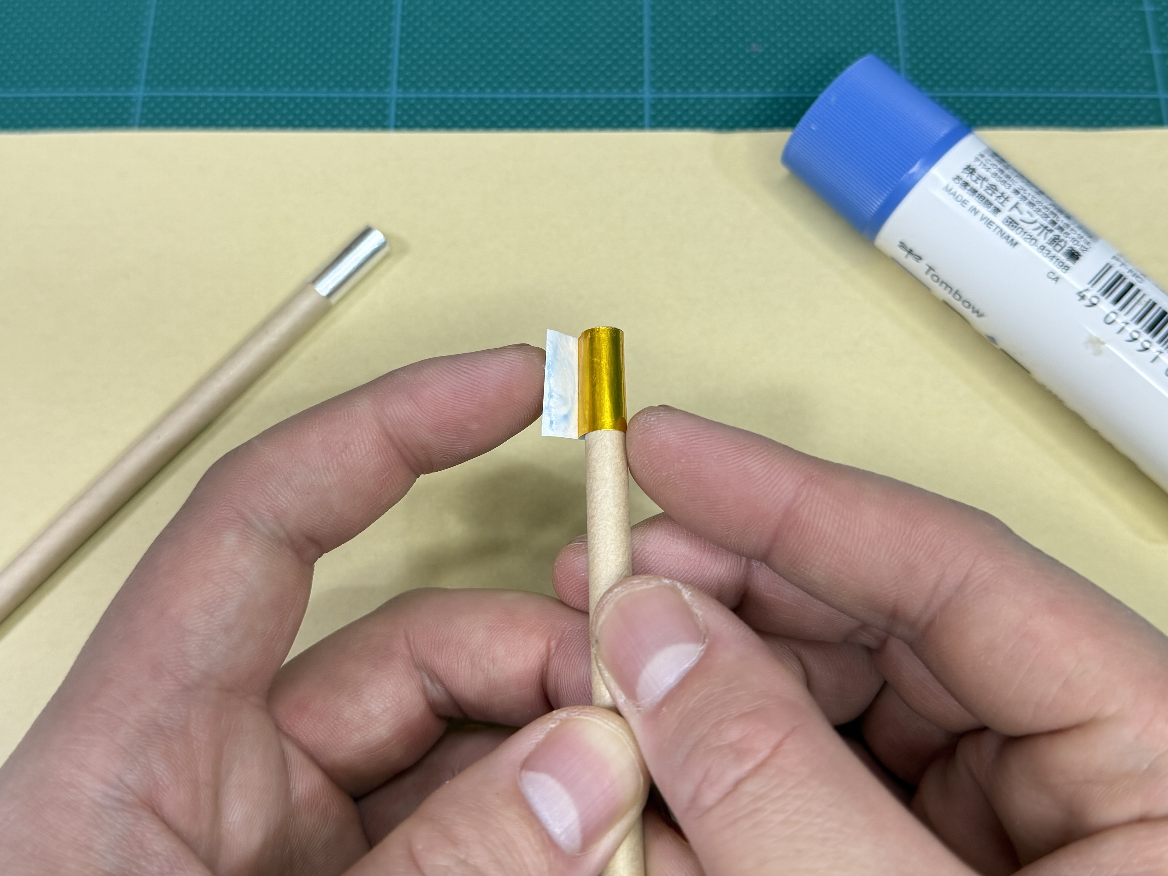 ② のりをつけ、紙ストローの端に巻きます。