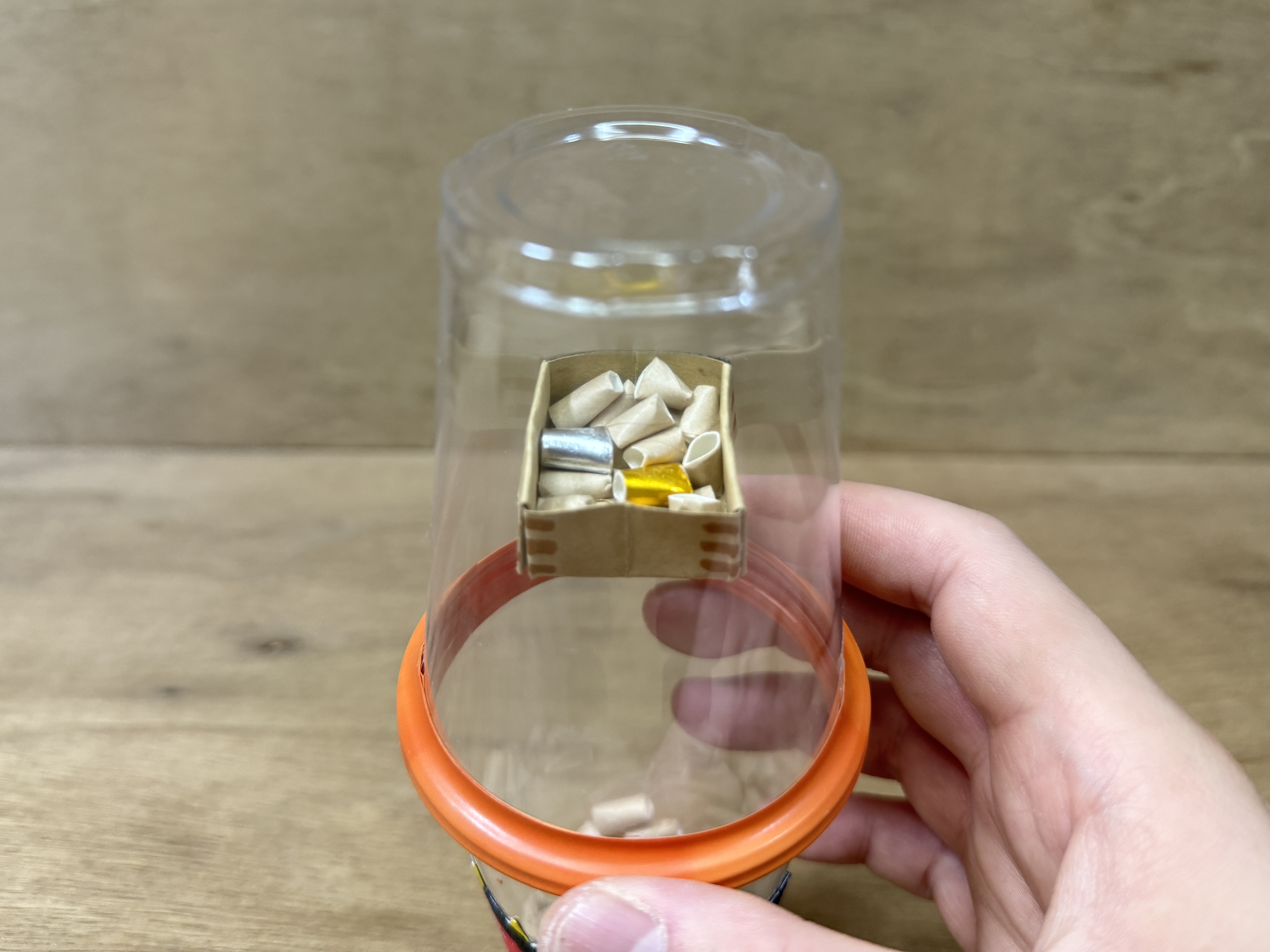 ③ 豆を入れたプラコップと②のプラコップの飲み口同士を合わせ、セロテープで貼ります。