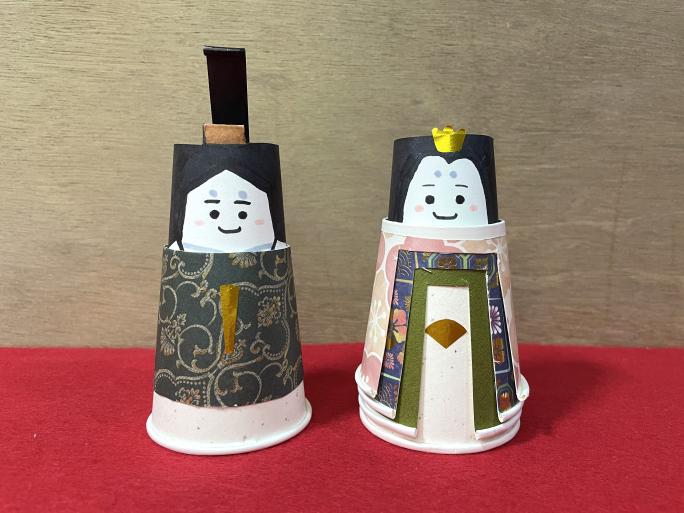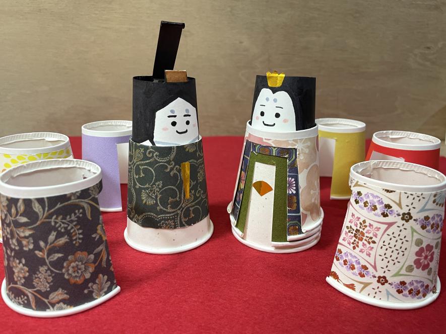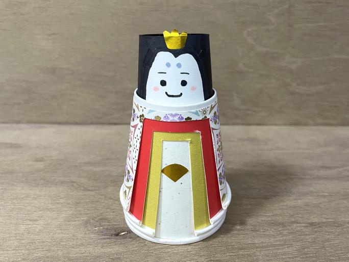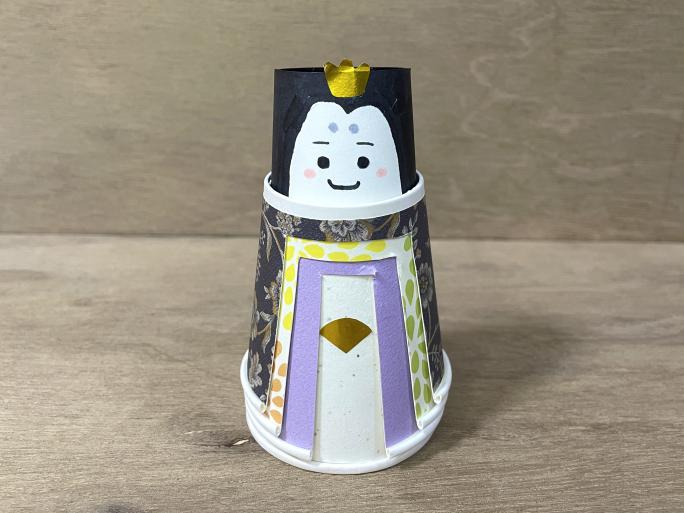 折り紙や千代紙を貼った紙コップを重ねることで、おひなさまの着物「十二単」の着せ替えを楽しめる、ひな人形の工作です。
