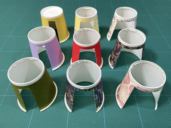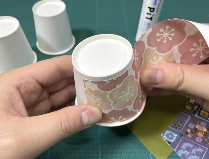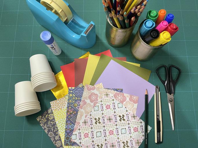 ※大きい紙コップで作る際は、柄をつけるための折り紙・千代紙を余分に用意しておきましょう!