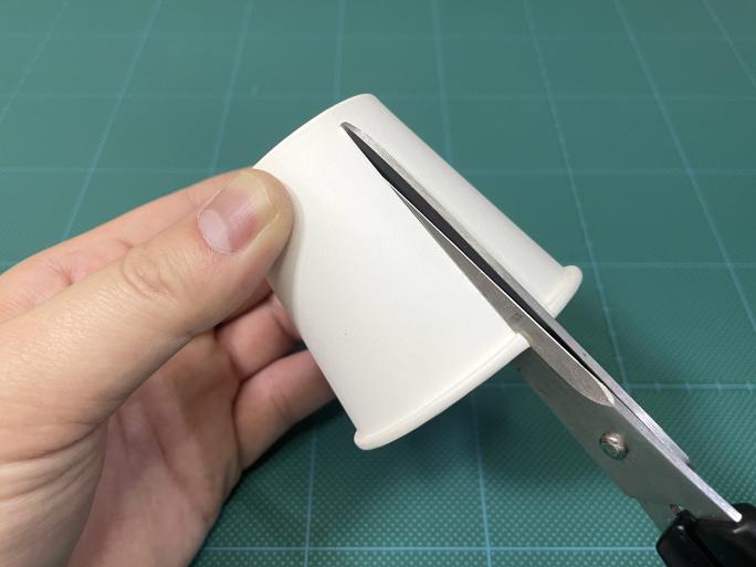 ③2つ目の紙コップにはさみで約3cm幅の切り込みを入れます。
