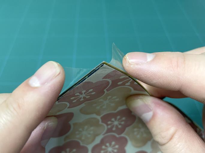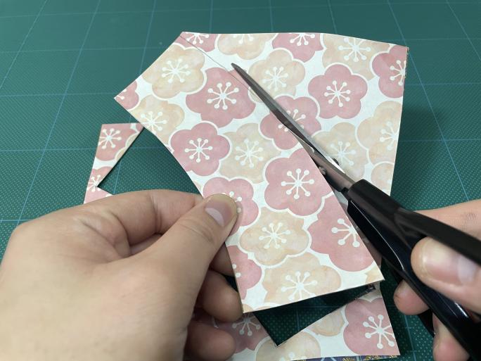 ⑤折り紙・千代紙を重ねたまま、④の形に切ります。