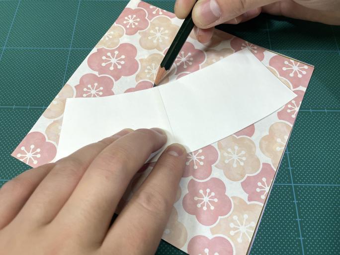 ④重ねた折り紙・千代紙に②を置き、鉛筆で型をとります。