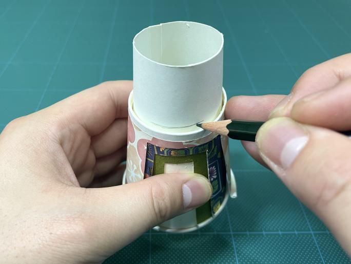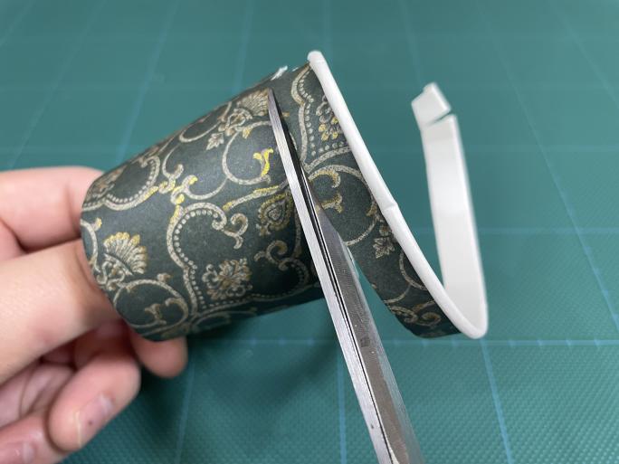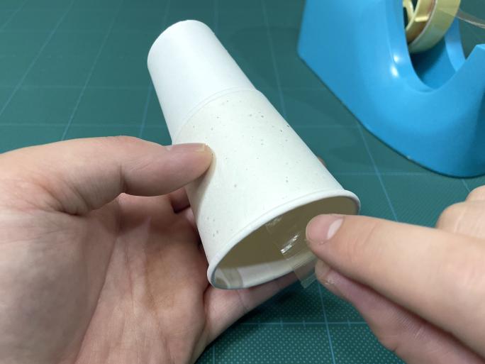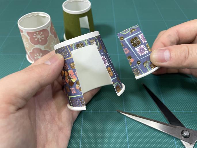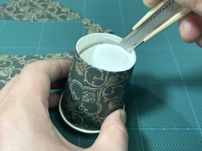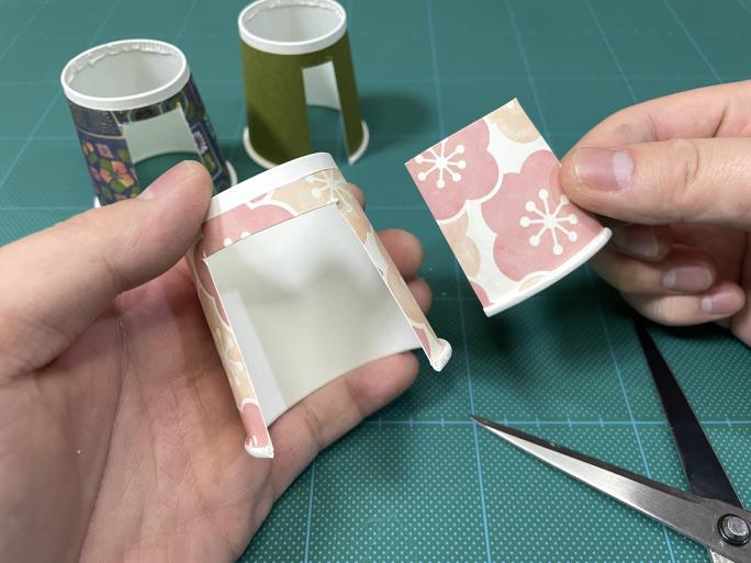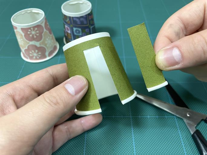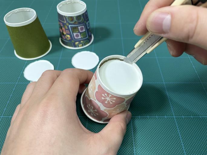 ⑥折り紙を貼った紙コップを、飲み口の部分から1cmほど切り落とします。