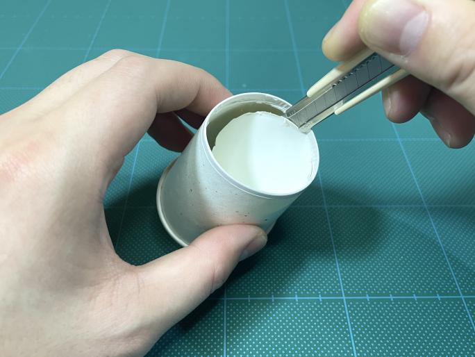 ①1つの紙コップに白系の色紙を貼り、底を切り落とします。