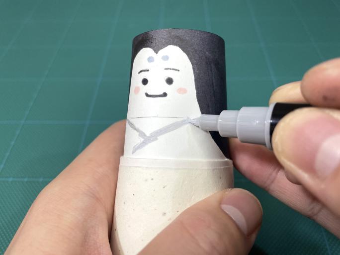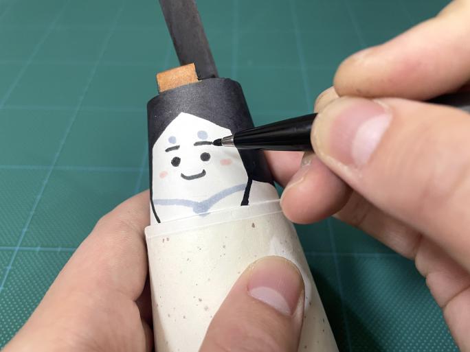 ④底をくりぬいた紙コップに通して貼り付け、立烏帽子(たてえぼし)の色を塗り、髪、目、口などを描きます。