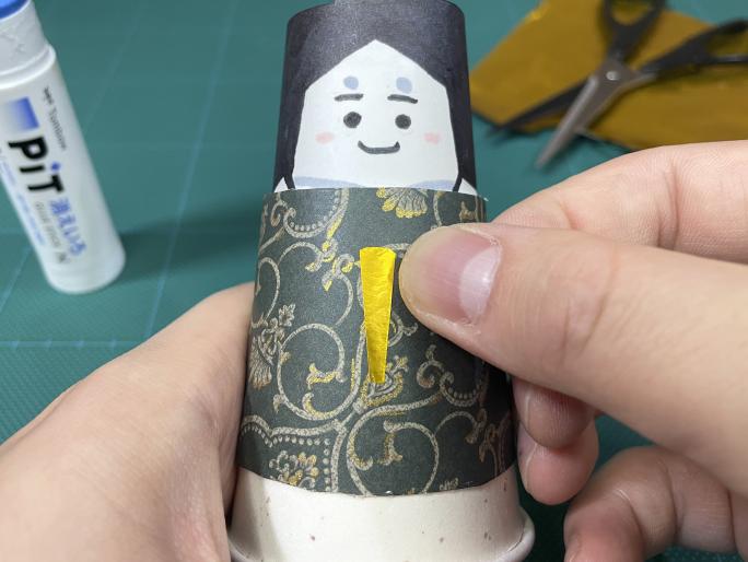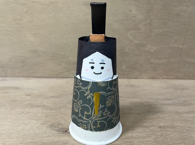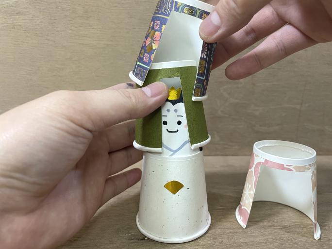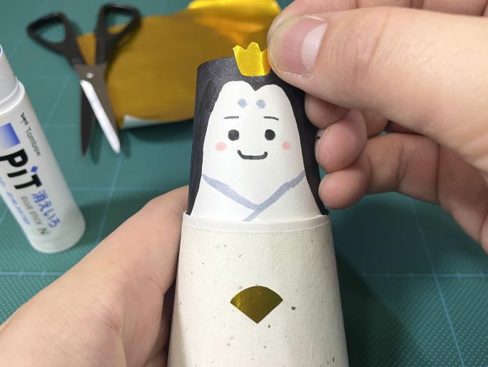 ⑦色紙を貼った紙コップを被せ、金の折り紙などで、笏(しゃく)を作って貼ります。