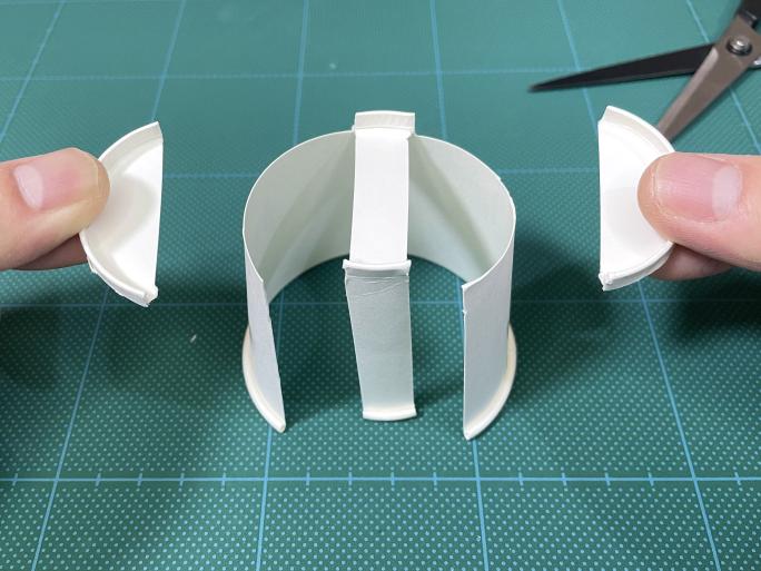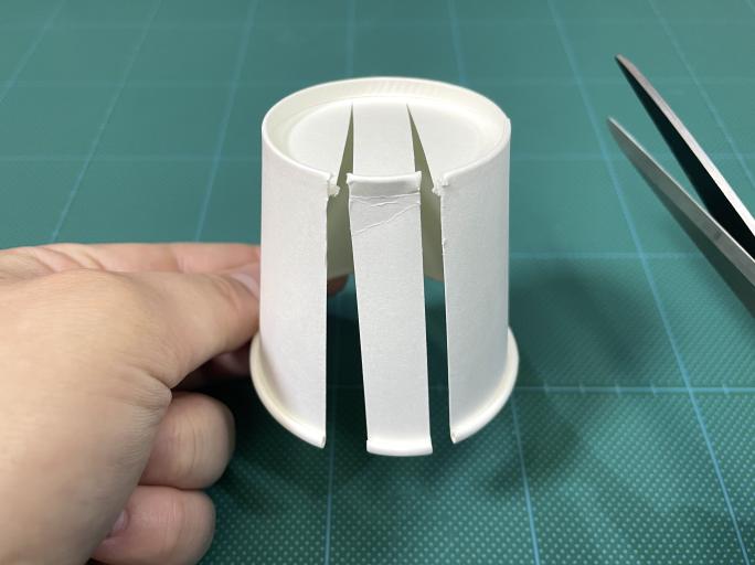 ④3つ目の紙コップにはさみで約4.5cm幅の切り込みを入れます。