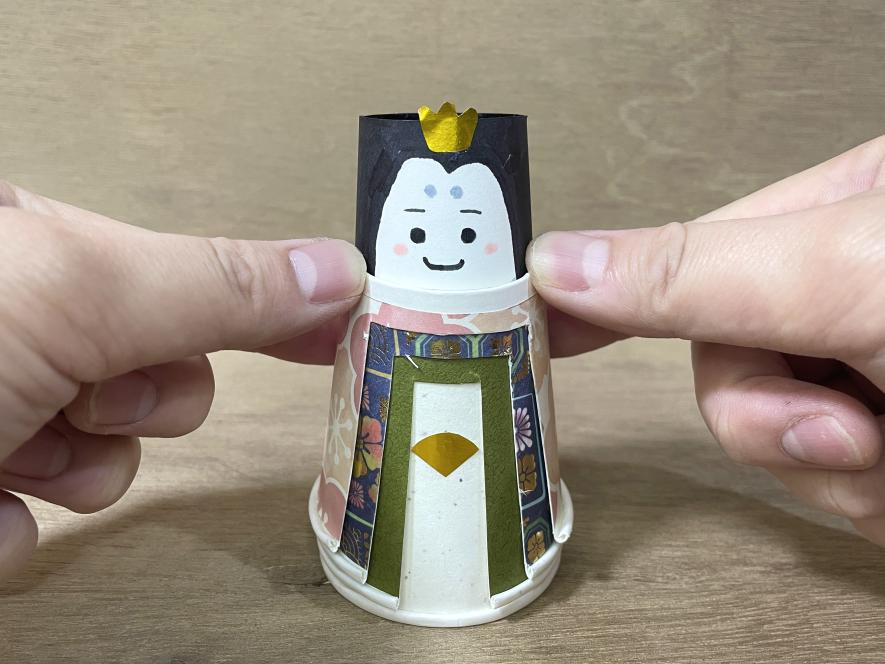 これで「おだいりさま」の完成です!お好きな着物のデザインの「おひなさま」と並べて、楽しんでくださいね!
