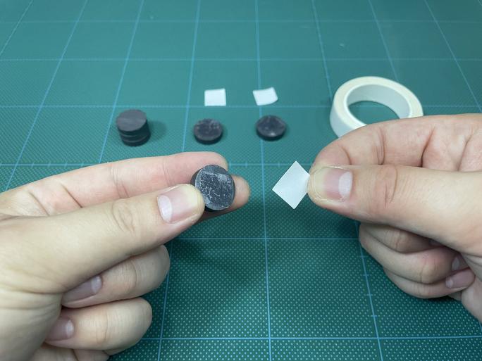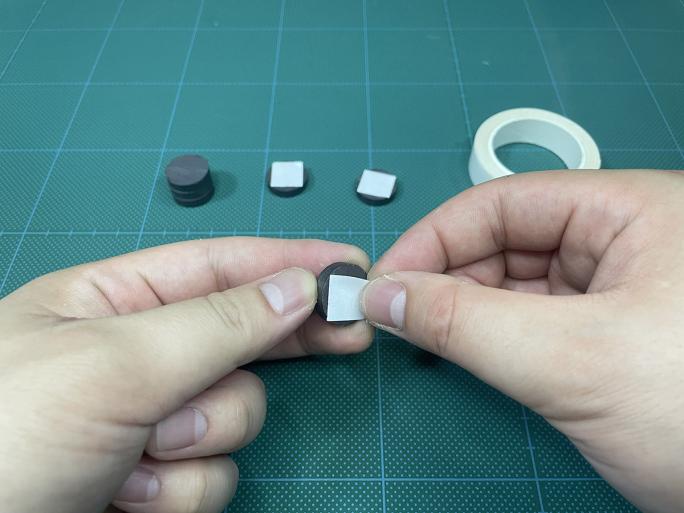 ④ 裏から他の磁石あて、挟むように③の両面テープを貼った磁石をつけます。