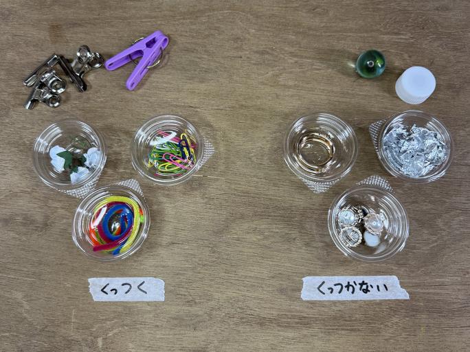 ② 余った磁石を近づけて、磁石に「くっつくもの」と「くっつかないもの」に分けます。