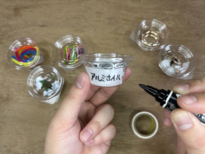④ マスキングテープや名前シールにものの名前を書き、ディップカップに貼ります。