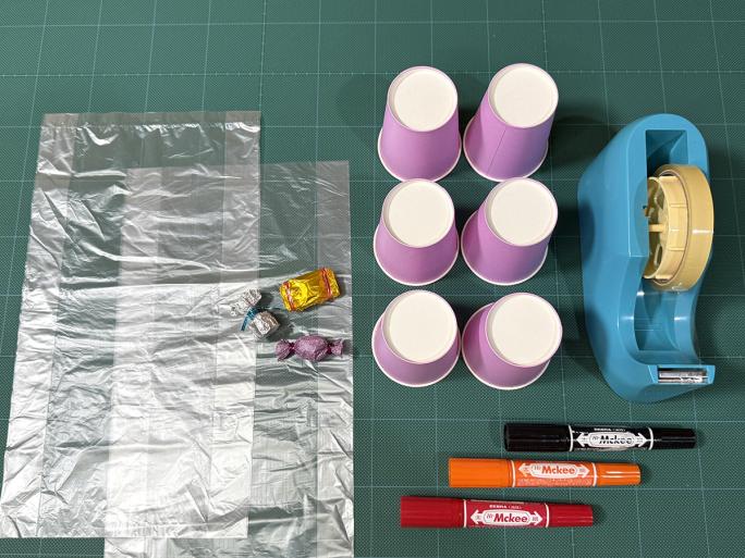 ※ポリ袋を入れた状態の紙コップと同じ高さになるように、お菓子の個数を調整しましょう!