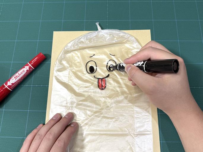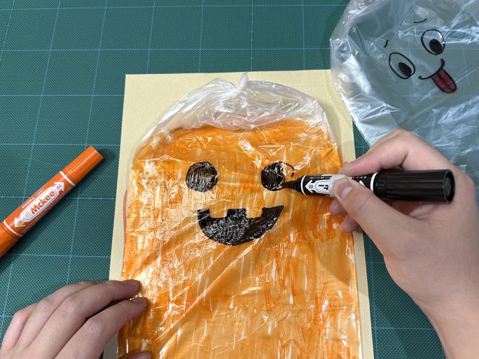 ③ ポリ袋の片面に油性ペンでお化けやかぼちゃの絵を描きます。
