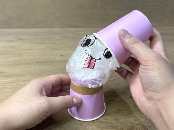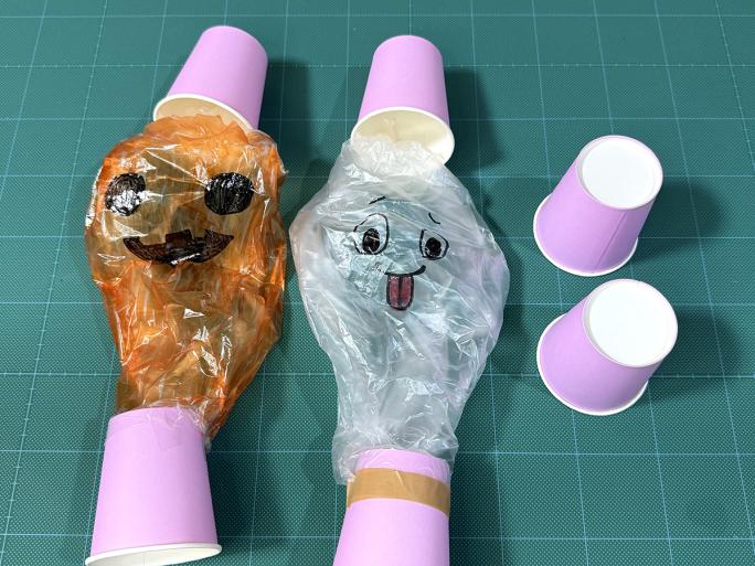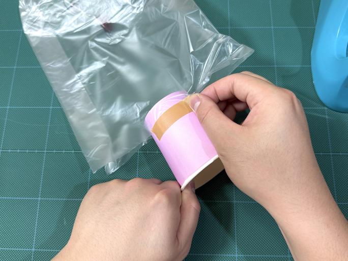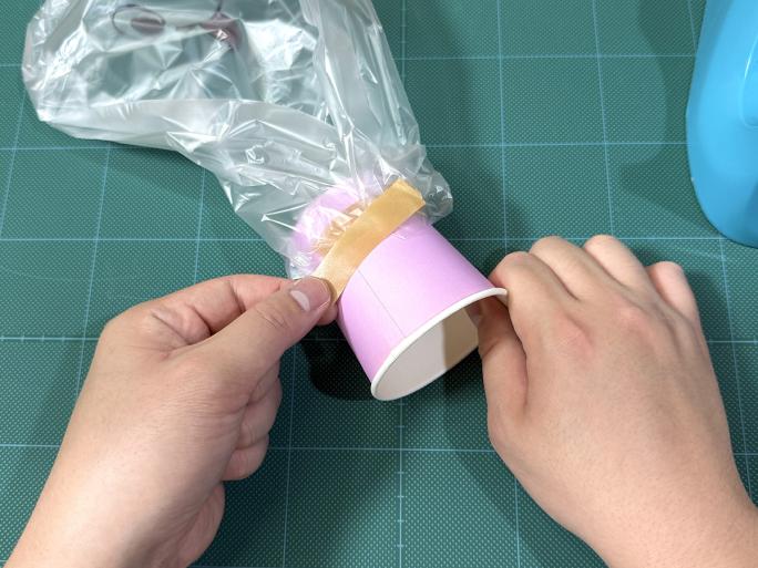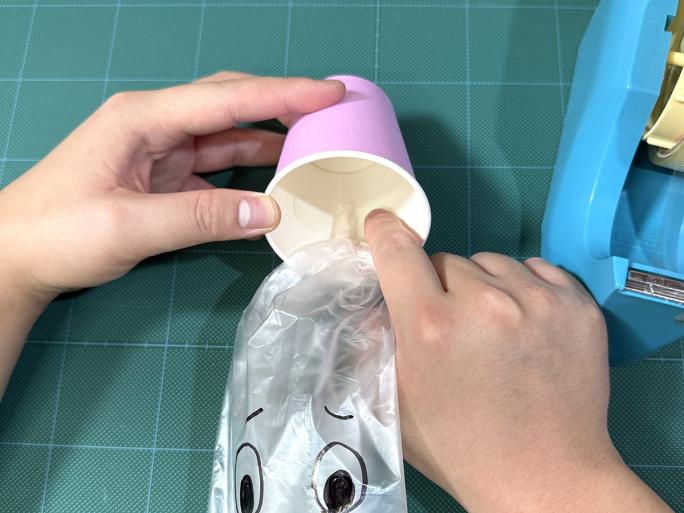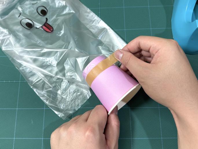④ 絵を描いた面を表にし、紙コップの底をポリ袋に入れ、テープでとめます。