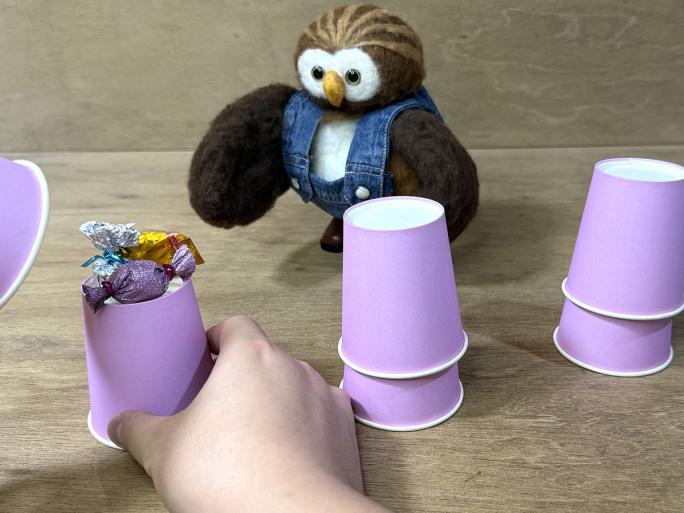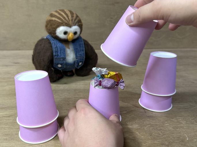 遊んでもらう相手に見せながら、余った紙コップの底にお菓子を入れ、紙コップを被せます。