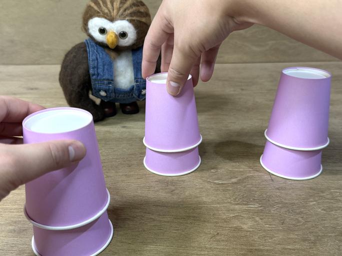3つの重ねた紙コップを、シャッフルします。たくさん入れ替えると難しい・・・。