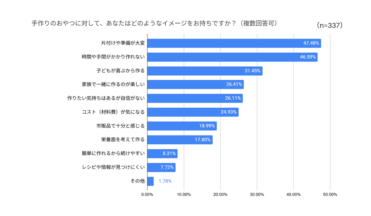 「虫歯や添加物が気になるので、できれば手作りおやつや果物にしたいがそこまでの時間の余裕がない。」「おやつも甘いものばかりを好むので、できるだけ手作りで野菜や果物を取り入れたいと思っていますが、忙しい日々の中でなかなか時間が取れず悩んでいます。」など、手作りおやつへの意欲がある一方、やはり「片付けや準備が大変」「時間や手間がかかり作れない」と思っている方は多く、約半数に上りました。一方で、「子どもが喜ぶから作る」「家族で一緒に作るのが楽しい」など、お子さんや家族との良いコミュニケーションの機会になりそうと思っている方も3割前後いらっしゃいました。