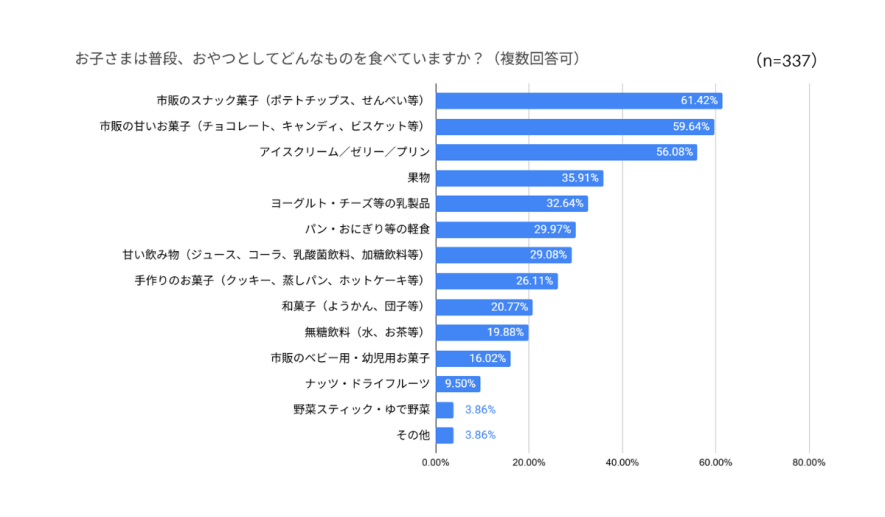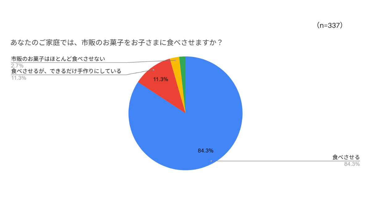 「市販のお菓子だと糖質、添加物が気になります。」「市販品で無添加をもっと増やしてほしい」など、市販のお菓子に含まれる添加物への不安の声も多数寄せられました。では、市販のお菓子をお子さんに食べさせている方はどのくらいいるのでしょうか。