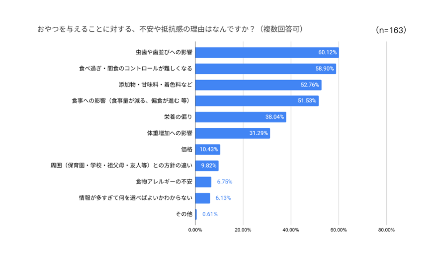 不安や抵抗感の理由は多岐にわたりますが、主に健康・栄養面、虫歯への懸念、および食事への影響と管理の難しさにあるようです。最も回答が多かったのが「虫歯や歯並びへの影響」で、約6割の方が不安の理由として挙げていました。「グミが好きでよく買いますが、虫歯が気になります。下の子も生まれ、お兄ちゃんが食べているおやつを欲しがるので早くからあげてしまっていて、そちらも虫歯が心配です!」「おやつも歯磨きするのが大変!」など、お子さんが好きなチョコレート、グミ、飴、アイスクリームといった甘いおやつの虫歯への影響を心配したり、おやつの後すぐに歯磨きをすることが難しいといった声が寄せられました。また前述の通り、おやつの食べ過ぎによって夕食をあまり食べなかったり、夕食の量が減ってしまうことも不安の理由のようです。