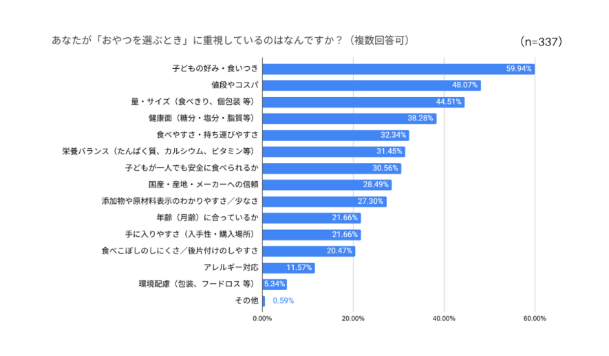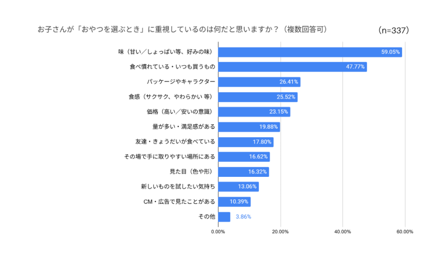 次に、お子さんたちは実際にどのようなものをおやつとして食べているのか調査しました。最も回答が多かったのは「市販のスナック菓子」「市販の甘いお菓子」で、それぞれ約6割の回答者のお子さんが食べているという結果に。「アイスクリーム/ゼリー/プリン」も56.1%と半数以上の方が回答しています。一方で、「果物」「ヨーグルト・チーズ等の乳製品」「パン・おにぎり等の軽食」は3割前後に留まる結果となりました。これらの食事の代わりになるものより、いわゆる“お菓子”の方がおやつとしてはよく食べられているようです。これらのおやつはどのように選ばれているのでしょうか。