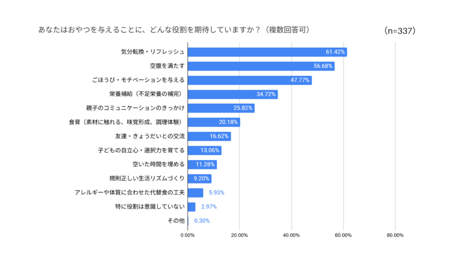 間食のイメージが強いおやつですが、保護者が期待する役割として、56.7%が回答した「空腹を満たす」を超え、最も多かった回答は「気分転換・リフレッシュ」で61.4%でした。次いで「ごほうび・モチベーションを与える」が47.8%、「栄養補給(不足栄養の補完)」が34.7%と、おやつに期待される役割は多岐にわたります。