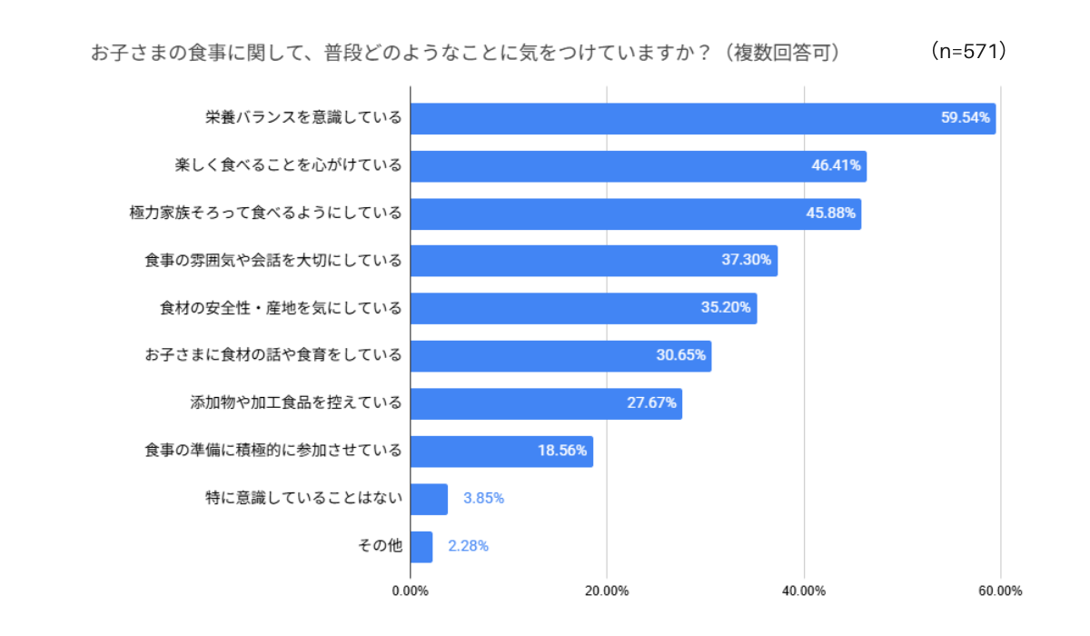 日々の食卓の中で、ヨメルバ会員が大切にしていることは何でしょうか。「お子さまの食事に関して、普段どのようなことに気をつけていますか?」という質問に対し、約60%の方が「栄養バランスを意識している」と回答しました。また、2位3位には「楽しく食べることを心がけている」(46.41%)、「 極力家族そろって食べるようにしている」(45.88%)が続きます。栄養を考え、楽しい雰囲気で食卓を囲むというのが、多くの保護者が目指す理想の姿であることが見受けられます。