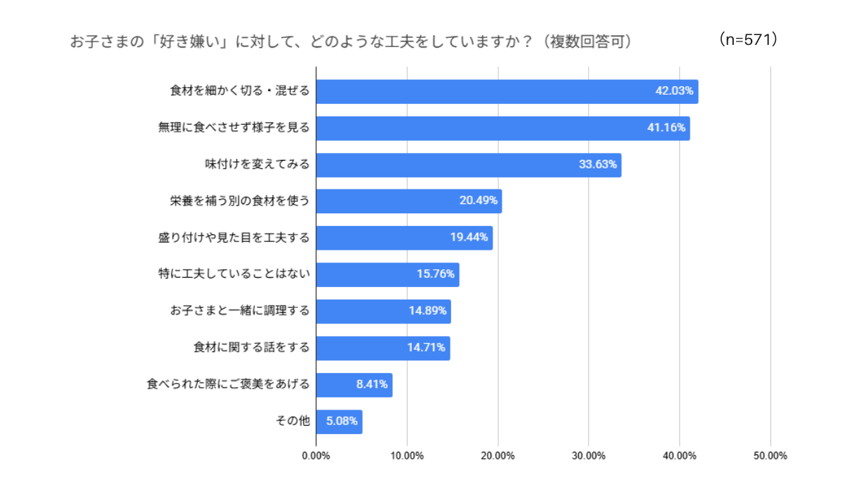 ヨメルバ会員の皆さんは、「子どもの好き嫌い」に対してどのような工夫をしているのでしょうか。1位は「食材を細かく切る・混ぜる」(42.03%)、2位が「無理に食べさせず様子を見る(41.16%)、3位が「味付けを変えてみる」(33.63%)という結果になりました。ただ食べさせることを強制するのではなく、食材の形や調理法を変えたり、子どものペースを尊重したりと、あくまで食事がポジティブな体験になるよう、試行錯誤を重ねている様子が伝わってきます。