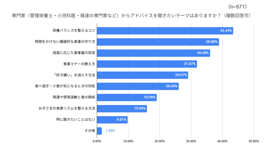 (58.32%)でした。「栄養バランス」の整った食事を、忙しい日々の中で「時間をかけずに」作る具体的な解決策を、非常に多くの保護者が求めていることが見て取れました。