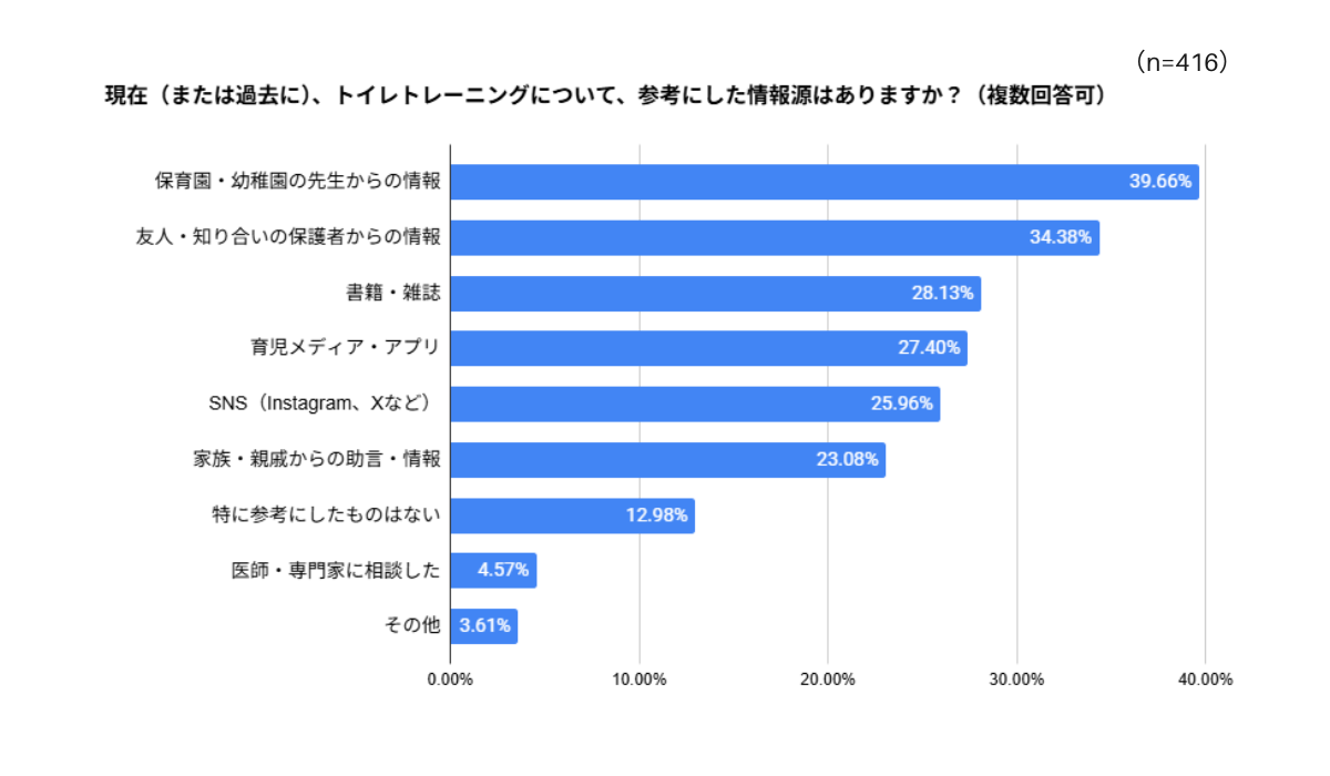 トイトレを進めるにあたって、どのような情報を参考にしているか(していたか)についても調査しました。 1位は「保育園・幼稚園の先生からの情報(39.66%)」 、2位は「友人・知り合いの保護者からの情報(34.38%)」と、現場のプロである「先生」や、身近な「友人・知り合い」からの情報が上位を占めました。保育園でトイトレをしてくれた、というコメントも複数見られました。一方で、情報が多すぎて困惑しているという声も。「いろんな情報がある中で、正しいやり方や自分の子に合ったやりかたの見つけ方が心配です。」「おまるを購入した方が良い。おまるは不要で補助便座からでよい。2つの意見を聞くので、どちらにすればよいのか、判断ポイントを知りたい。」など、どの情報に頼ってよいか分からないという方も多いようです。